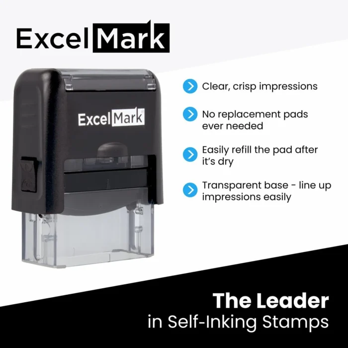 ExcelMark’s Exclusive Double-Sided Ink Pad Ordinary ink pads offer a certain number of impressions before they begin to fade. When this happens, the pad needs to be re-inked or replaced. Not so with ExcelMark’s patented reversible pad. When the impressions begins to fade, simply slide the pad out, flip it over, and reinsert to instantly double the life. Superior Construction The stamp is designed to stand up to daily use, and features a superior ABS plastic frame, as well as a durable die-plate that resists the distortion common with plastic dies. A clear plastic anti-slip base makes it easy to align each impression and keep the stamp steady while in use. Stamp it With Quality ExcelMark is a leader in the self-inking rubber stamp market, offering exclusive features like our patented double-sided ink pad. We understand that you expect a stamp to last, so we focus on developing innovative solutions to make our products more convenient for home, office and craft use. ExcelMark quality stamps are assembled in the USA and subjected to a rigorous quality control process to ensure reliable, quality impressions time and again.