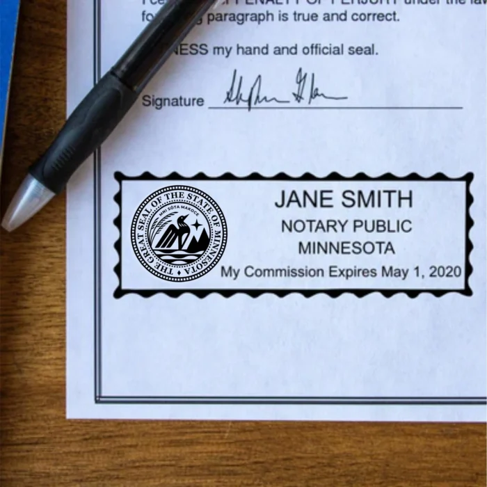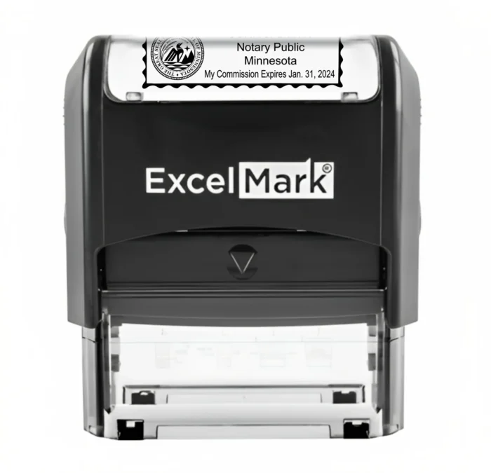 This Minnesota notary stamp for professional notaries creates a high quality seal impression using a rectangle self-inking notary stamp. A self-inking notary stamp mount re-inks the rubber die into the self-contained ink pad before each impression, making it ideal for quick, repetitive stamping during those busy work days. In addition, the ExcelMark self-inking brand features a unique, reversible (two-sided) ink pad that doubles the life of the pad. Simply push it out, flip it over, reinsert and keep stamping! Each side of your ExcelMark ink pad initially lasts for thousands of impressions and is simple to re-ink and replace. A clear base on the mount allows you to easily line up those impressions.
