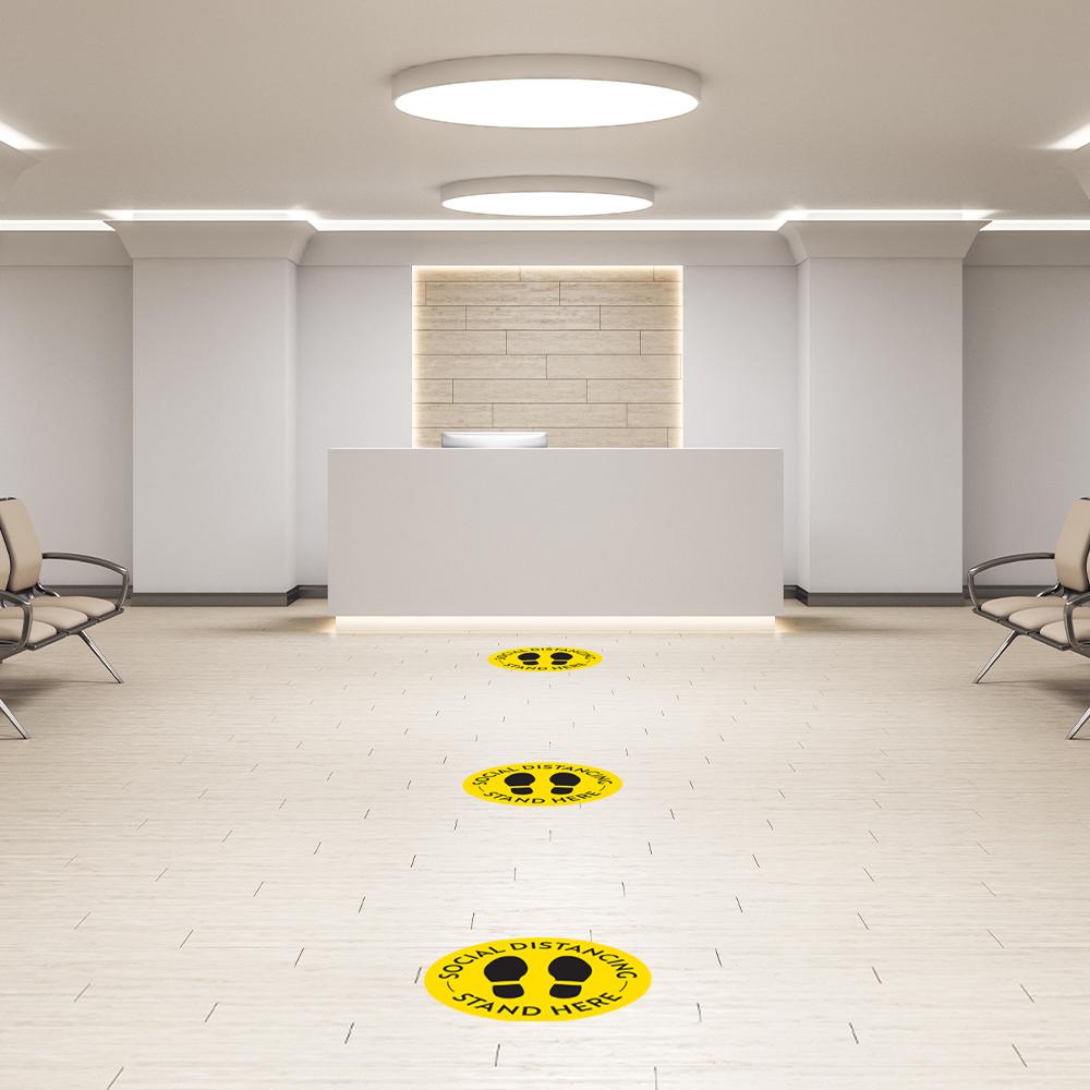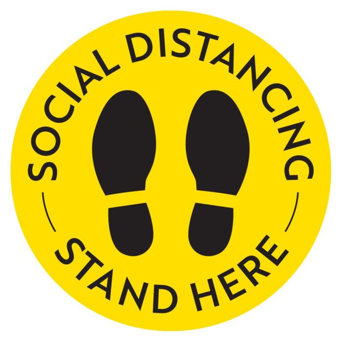 Display this vibrant floor decal as a friendly reminder to adhere to the rules of social distancing. The high-grade polyester construction features a secure grip and resists tearing, stretching and high-traffic activity. These decals work well in grocery stores, airports, restaurants, malls and convention centers. Application works on all indoor hard surfaces, including tiles, concrete, laminate floors and even low pile carpet tiles. When no longer needed, easily remove your Social Distancing Floor Decal with one smooth pull.
